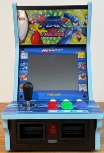 Arcade-inspirierter Mini-Automat mit fest installiertem Spieleset und Cartridge-Slot.