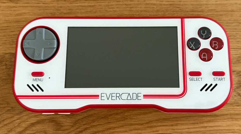 Kompaktes Handheld mit vorinstallierten Spielen, kompatibel mit allen Evercade-Cartridges.